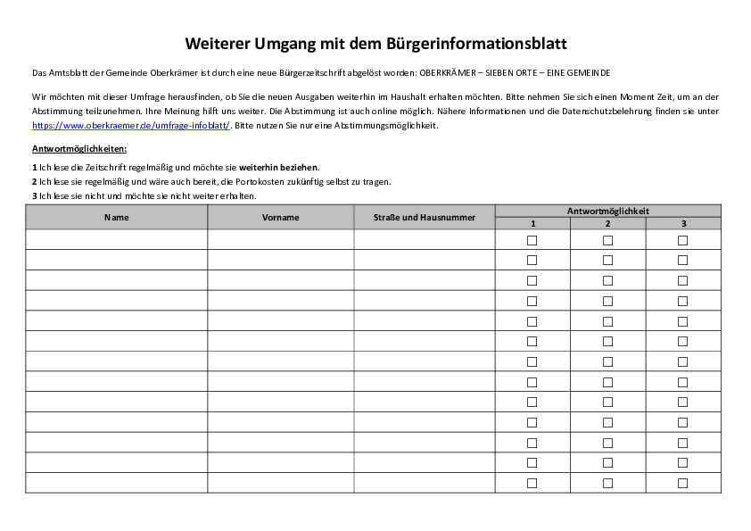 Während des Jahres 2026 wird der tatsächliche Bedarf an einer gedruckten Ausgabe des Informationsblattes "Oberkrämer 7 Orte eine Gemeinde" ermittelt. Bürgerinnen und Bürger, die auch ab 2027 weiterhin regelmäßig ein Exemplar erhalten möchten, werden gebeten, ihren Wunsch zur Zustellung aktiv mitzuteilen. Die Mitteilung erfolgt unverbindlich. Dies kann schriftlich oder per E-Mail an redaktion@oberkraemer.de erfolgen. Je nach Rückmeldung wird wie folgt verfahren: